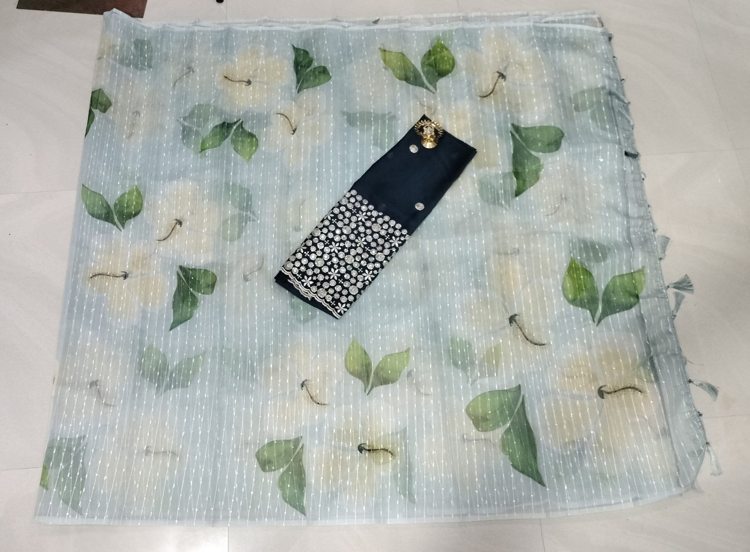• Blouse Detail: ఈ చీరతో పాటు వచ్చే Work Blouse హైలైట్ అని చెప్పవచ్చు. ఇది సాదా చీరకు ఒక డిజైనర్ టచ్‌ను జోడిస్తుంది.